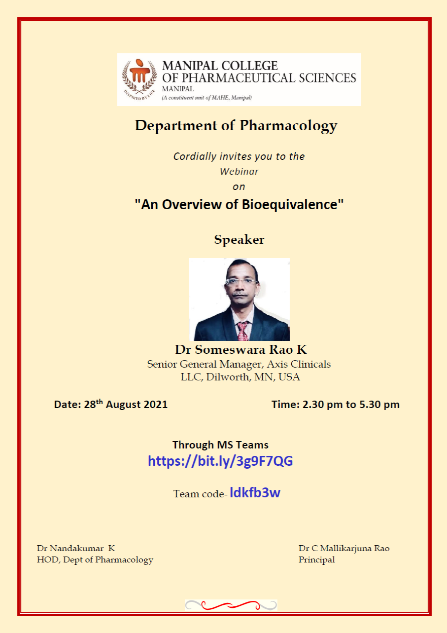 Department of Pharmacology is organizing a guest lecture on the topic, 'An overview of Bioequivalence' on 28 August, Saturday at 2:30 pm IST