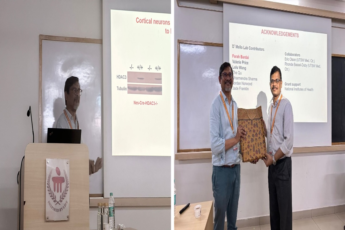 The seminar concluded with a scientific discussion benefiting the faculty, research scholars, and PG students. Around 100 participants attended and benefited from the lecture. Following the talk, a 20-minute discussion session was held, where like-minded individuals at MAHE working in the area of HDAC and neurodegeneration brainstormed and identified potential areas for collaboration. Dr. S.S. Mutalik thanked the speaker, audience, and organizing team, and presented Prof. D’Mello with a memento as a token of appreciation on behalf of MCOPS.