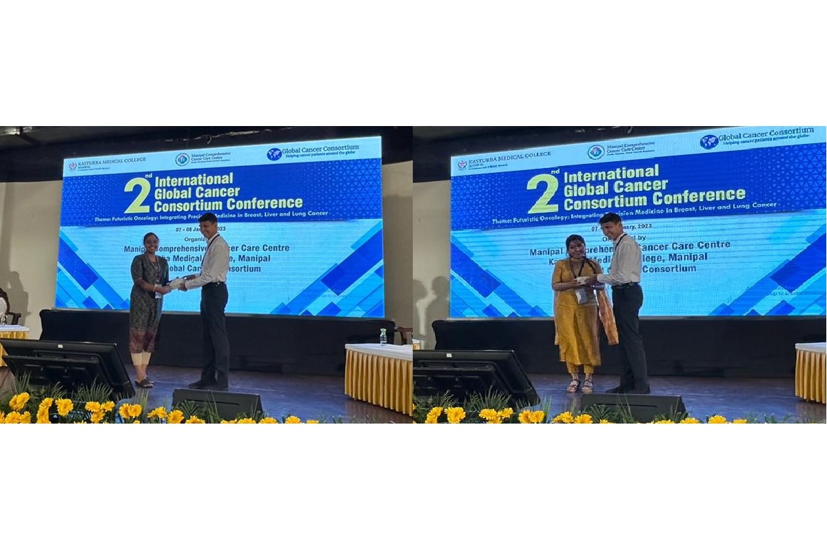 Ms. Gayathri Baburaj and Ms. Anmi Jose, Research Scholars, Dept. of Pharmacy Practice, MCOPS, received first and second prizes, respectively, for poster competitions in the 2nd International Global Cancer Consortium Conference (GCCC), held on 7 January 2023 at Manipal. The conference was organized by Global Cancer Consortium (GCC) in association with Manipal Comprehensive Cancer Care Centre, Kasturba Medical College, Manipal. Ms. Gayathri received the award under the “Clinical research” category for the study “ Survival analysis of non-small cell lung cancer patients: a non-parametric time to event model”. Ms. Anmi received the award under the “Translational research” category for the study “Repurposing of antiviral drugs targeting KDM5B oncogene in breast cancer using bioinformatics, in silico and in vitro tools: a precision medicine approach”. Both research scholars are pursuing Ph.D. under Dr. Mahadev Rao, Professor, Department of Pharmacy Practice, MCOPS, Manipal.