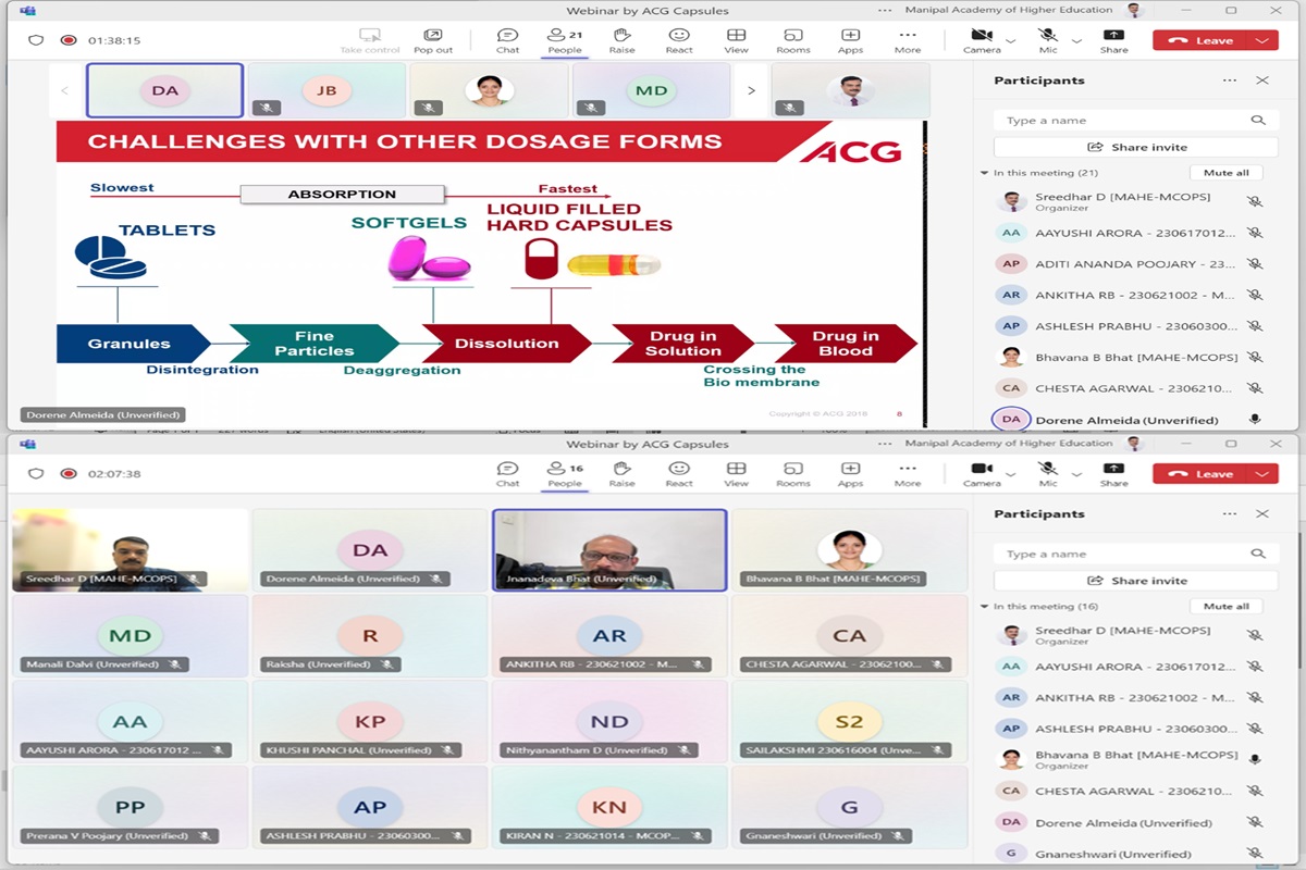 Department of Pharmaceutical Regulatory Affairs and Management, Manipal College of Pharmaceutical Sciences, MAHE, Manipal and ACG Capsules, Mumbai jointly organized a webinar on Insights into ACG’s Oral Dosage Technology on 19 March 2024, through MS Teams. The webinar featured presentations by Dr Jnanadeva Bhat, Head - Formulation R&D, and Ms Dorene Almeida, Lead – Application Lab in R&D, ACG Capsules, Mumbai. They provided valuable insights into ACG's oral dosage technologies, focusing on the journey of capsule manufacturing process.