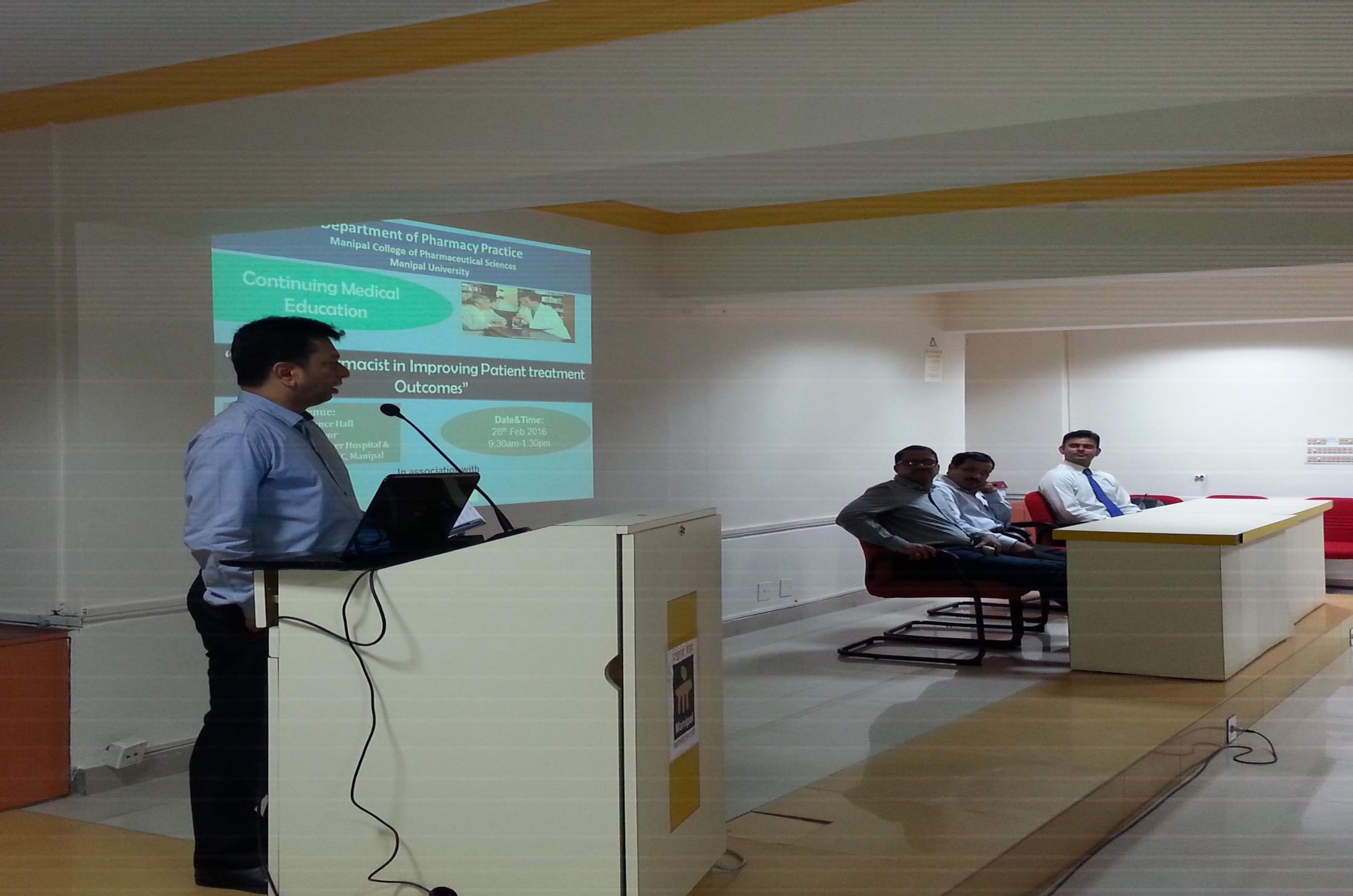 Pharmacists can provide better patient care and help busy physicians in improving treatment outcomes, said Dr. Padmaraj Hegde (Deputy Medical Superintendent, Kasturba Hospital, Manipal), who was inaugurating the CME program for pharmacists, organized by the Department of Pharmacy Practice, MCOPS, Manipal Academy of Higher Education in association with Pfizer Inc. on 28th Feb 2016 at Kasturba Hospital, Manipal. The CME program was based on the Pharmacists Training Module prepared by the PharmD students (Mr.Munawar PV, Mr.Mazaher Kaki and Ms. Shivani Mital) of Manipal College of Pharmaceutical sciences (MCOPS) under the guidance of Dr. Girish Thunga, Assistant Professor, Department of Pharmacy Practice. The module covered the basic skills required for the hospital pharmacists that include Leadership skills, Patient counseling, Medication error and Management of common ailments using OTC drugs. The sessions were handled by Dr. M Surulivel Rajan, Associate professor, Department of Pharmacy Practice and Dr. Girish Thunga. Dr. Sravanth Karthik Chelari, Regional Medical Advisor, Pfizer, spoke on the role of pharmacists in improving patient treatment outcomes. Mr. Prasanna Kumar K, Chief Pharmacist, Kasturba hospital, Attavar, Mangalore and Mr. Suresh Chandra Pai, Chief Pharmacist, Kasturba Hospital, Manipal presided over the event. In today’s highly competent and globalized world, it is necessary to have such events more frequently, said one of the participants. The students said that more modules are being prepared for training practicing pharmacists to make them competent globally.