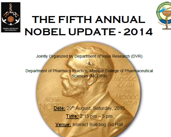The Fifth Annual Nobel Update was jointly organized by Department of Pharmacy Practice, MCOPS and Department of Virus Research, Manipal Academy of Higher Education on August 29, 2015. Apart from the regular sessions on Nobel Prizes in Physics, Chemistry and Physiology & Medicine, a special feature on Kailash Satyarthi (Nobel Peace Prize Laureate) by Dr. Ida Dsouza (Faculty, Department of Public Health, MU) was the highlight of this year's event. This venture is primarily intended to impart a multidisciplinary perspective to the divergent curricular themes of Manipal Academy of Higher Education. The organizers also announced a prize (a travel grant) to those who would successfully predict the Nobel Prize in Physiology and Medicine 2015. “All the talks are highly informative and motivating one. Such programs are need of the hour for inspiring younger generations. I am very happy to be a part of this program” said a PharmD student