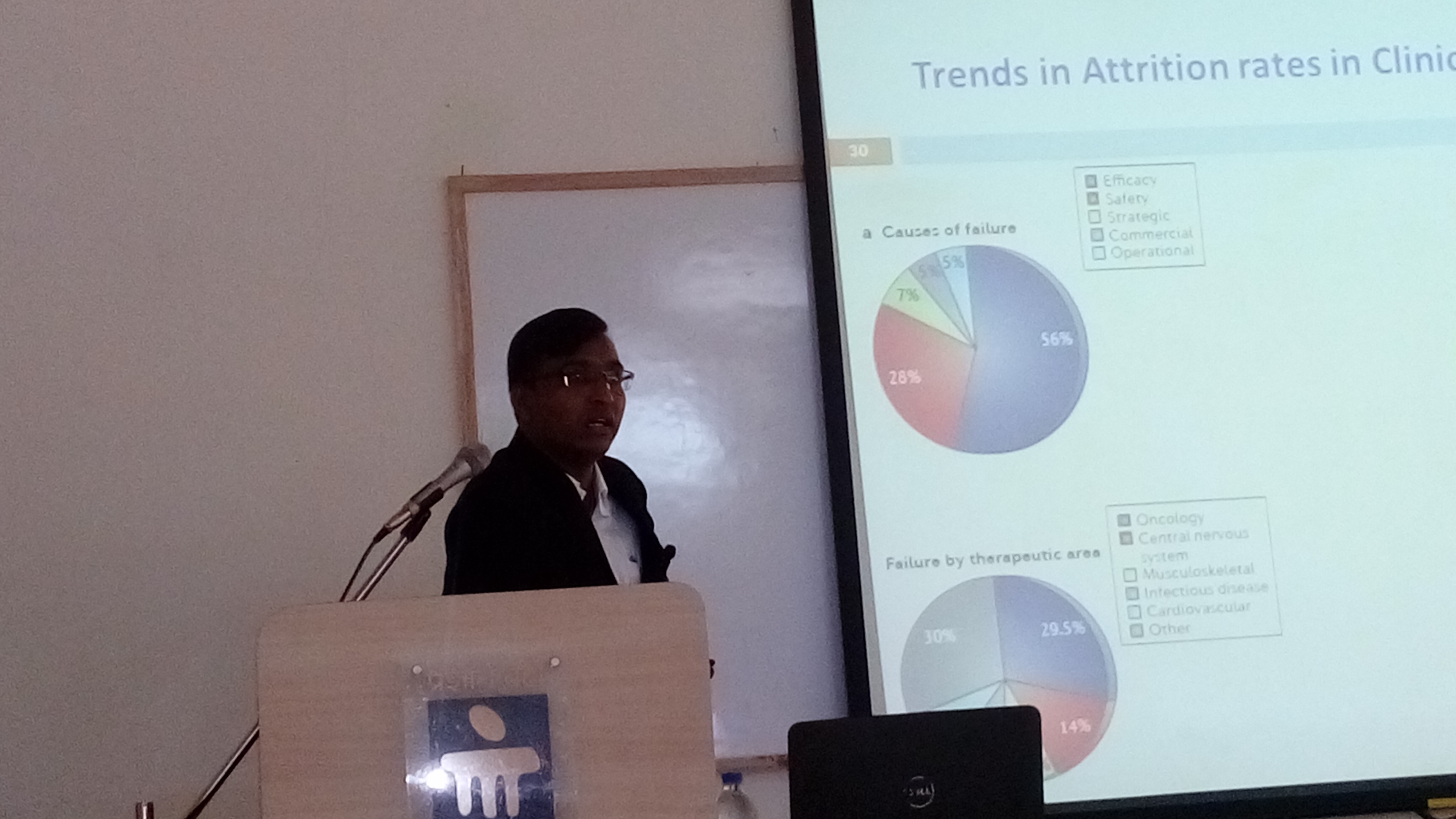 Department of Pharmaceutical Chemistry, MCOPS organized a talk on 13 August 2016 in the Dr P Gundu Rao Conference Hall of MCOPS. Mr. Umakant Ashok Bahirat, Research Scientist, Department of Pharmacology-Novel Drug Discovery and Development Lupin Limited (Research Park), Pune was the resource person and delivered a talk titled “Drug Discovery: A Challenge”. The talk was organized as a part of curriculum enrichment program and was attended by postgraduate students and faculty members. Mr. Bahirat explained the challenges faced by scientists in different stages of drug discovery. The talk also focused on the types of biomarkers and their importance in drug discovery. Dr G Gautham Shenoy, Head, Pharmaceutical Chemistry welcomed the gathering and introduced the speaker. Dr. M Sreeenivasa Reddy, Vice-Principal presented a memento to the speaker. Following the guest lecture, Mr. Umakant Ashok Bahirat interacted with the postgraduate students of Department of Pharmaceutical Chemistry. The speaker answered the queries raised by the students with regard to future prospects and competencies that students must possess. The career opportunities that are available to the students was explained by the speaker. Mr. Bahirat urged the students, the need to have industry preparedness. Mr. Umakant also held discussion with the faculty members of the department of Pharmaceutical chemistry regarding the syllabus content of postgraduate program in Pharmaceutical Chemistry. He gave valuable suggestions regarding the topics that may be included in the syllabus.