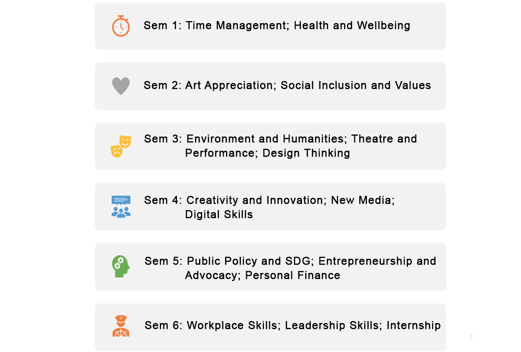 The program incorporates credited coursework in Extra Disciplinary Competencies (EDC) through six semesters to nurture valued skillsets and to support self-development.