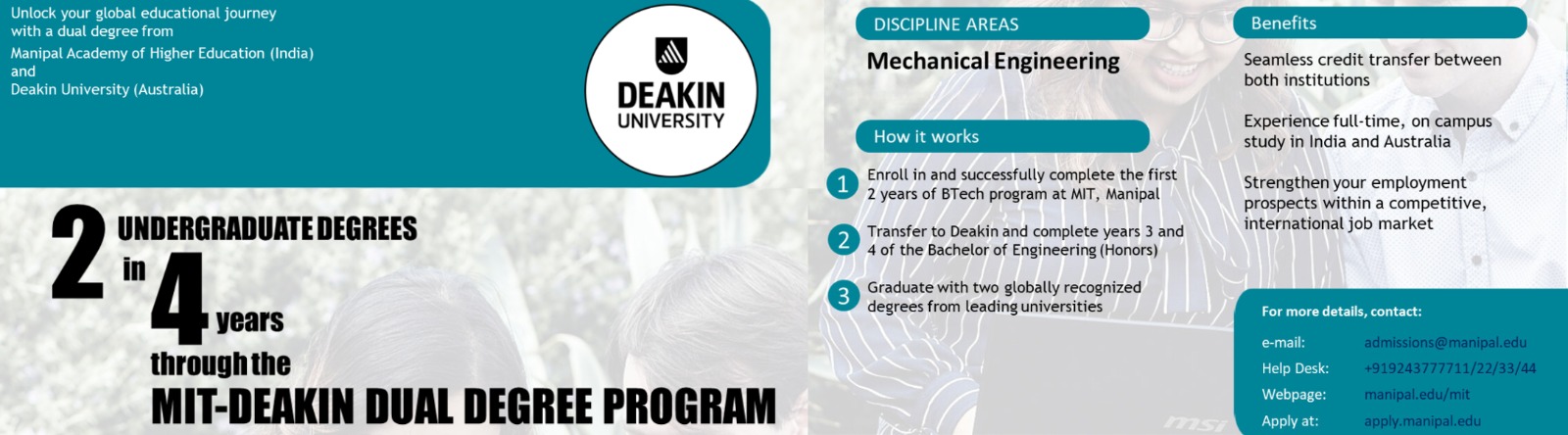The department offers a dual degree program that allows students to complete two undergraduate degrees in four years. Students begin by enrolling in and successfully completing the first two years of the Bachelor of Technology (BTech) program in the Mechanical stream at the Manipal Institute of Technology (MIT). Following this, they transfer to Deakin University to complete the remaining two years of the Bachelor of Engineering (Honours) program. Upon successful completion of the program, students graduate with two globally recognized degrees from two leading universities, MIT and Deakin University, enhancing their academic credentials and career prospects. (Brochure)