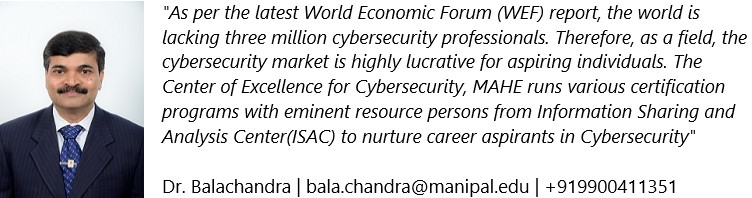 MAHE, Manipal has signed an MoA with the Information Sharing and Analysis Center(ISAC) which is a public-private-partner of the Ministry of Education, Computer Emergency Response Team (CERT-IN), MeitY (The Ministry of Electronics and Information Technology), Govt. of India, All India Council for Technical Education (AICTE) and other Public Sector and Corporate Bodies for advancing the cyber security capacity building and training 1,00,000 professionals for empanelment in National Security Database (NSD) program and Clean Exit, Ethics at Workplace. This collaboration leads to an establishment of a Professional level Center of Excellence(CoE) at MIT, MAHE.