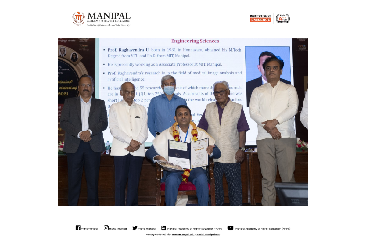 Dr Raghavendra U., Associate Professor and Deputy Registrar - Administration, MAHE, Manipal has been awarded with the prestigious Prof. Satish Dhawan Young Engineer State Award in the field of Engineering Sciences, instituted by the Government of Karnataka. He received this award on 23rd March 2023 at J N Tata Auditorium, Indian Institute of Science, Bengaluru from Dr C. N. Ashwath Narayan, Hon’ble Minister for Higher Education, Electronics, IT, BT and S&T, Government of Karnataka in the presence of Bharat Ratna Prof. C.N.R. Rao, Sri A S Kiran Kumar (Former Chairman of ISRO), Prof. Govindan Rangarajan (Director, IISc) and Dr E V Ramana Reddy (Additional Chief Secretary). Dr Raghavendra U. is an eminent researcher in the area of Artificial Intelligence and Medical Image Analysis. He has more than 50 research publications in reputed journals and a patent to his credit. He is currently guiding many research students and also set his research collaborations at various international levels. Recently, he has been short listed in world’s Top 2 Percentile Researcher, as released by Stanford University USA.