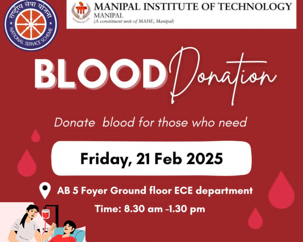 The MAHE-MIT NSS Units are organizing a Blood Donation Camp for the month of February at campus, reinforcing their commitment to community service and healthcare. The event will take place at AB5 (E&C Foyer/Entrance), providing students, faculty, and staff with an opportunity to contribute to this life-saving initiative. Blood donation plays a crucial role in saving lives, and this camp aims to encourage voluntary participation for the greater good.
