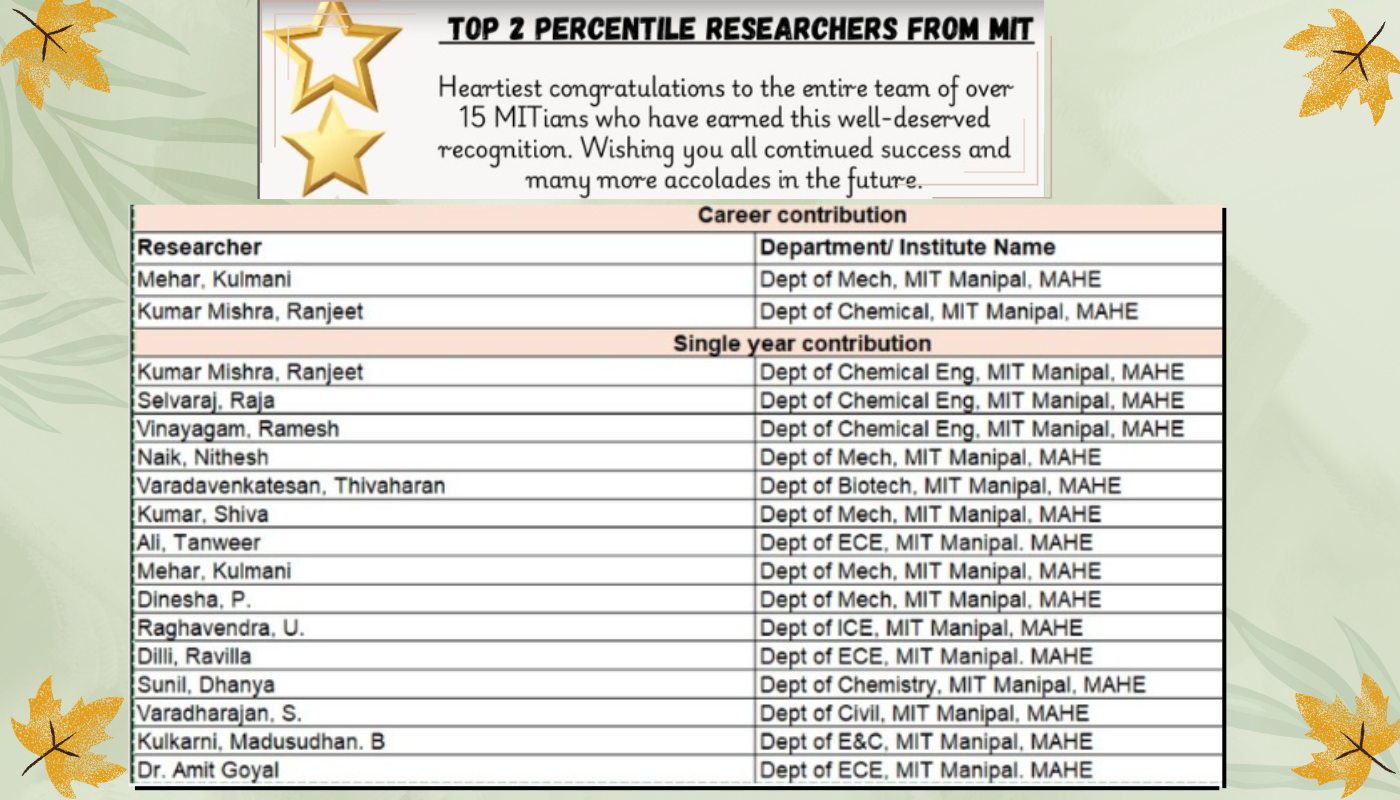 15 MIT Manipal Faculty Members Recognized Among Top 2% Global Researchers for Career and Single-Year Contributions