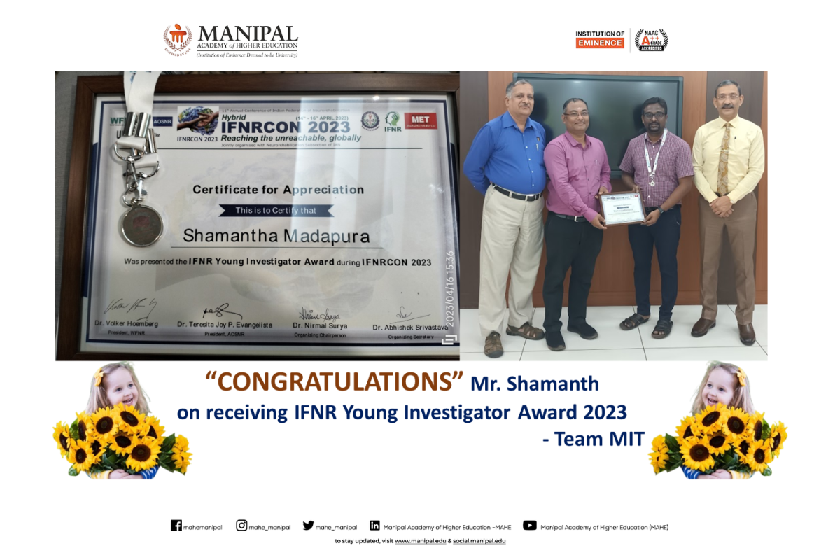 Shamanth Madapur, Research Associate, Medical Device lab, BME, MIT, Manipal, is recognized with the Young Investigator Award 2023 from the Indian Federation of Neurorehabilitation (IFNR). The development of a "Head and Trunk Control Rehabilitation Device for Children with Cerebral Palsy" is a Project from MIT, KMC, and MCHP is working on. Dr. Venkatesan (BME) is the team leader for the above-mentioned work, and Mr. Harikishan Shetty (BME) provides technical support. Dr. Sivakumar G (KMC), Dr. Bhamin K Rao (MCHP), and Shristi Shakaya (MCHP) provide clinical support.