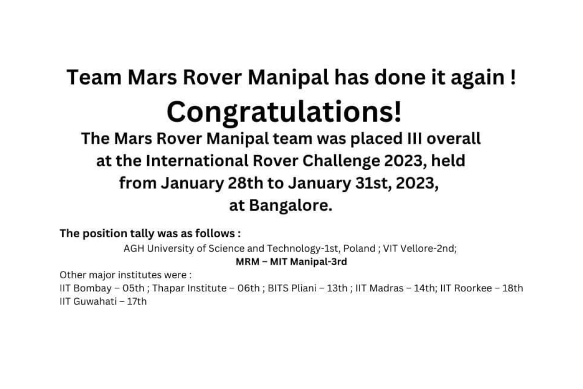 Heartiest congratulations to Mars Rover Manipal Team of MIT for the outstanding achievement.