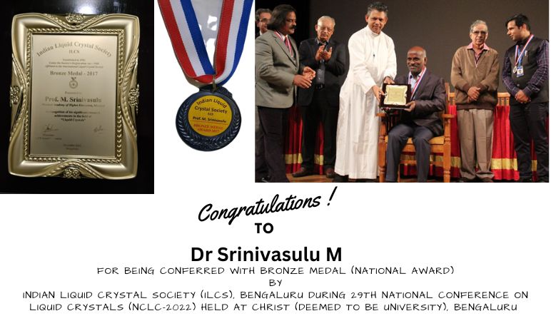 Dr.Srinivasulu M, Associate Professor (Senior Scale ) of the Chemistry department, was honored with a National award, Bronze Medal Award by the Indian Liquid Crystal Society (ILCS), Bengaluru, during the 29th National Conference on Liquid Crystals (NCLC-2022) held at CHRIST (Deemed to be University), Bengaluru under the auspices of the ILCS, on 8th December 2022 in recognition of the steady academic growth with notable scientific contributions in the field of Soft Matter, particularly Liquid Crystals.