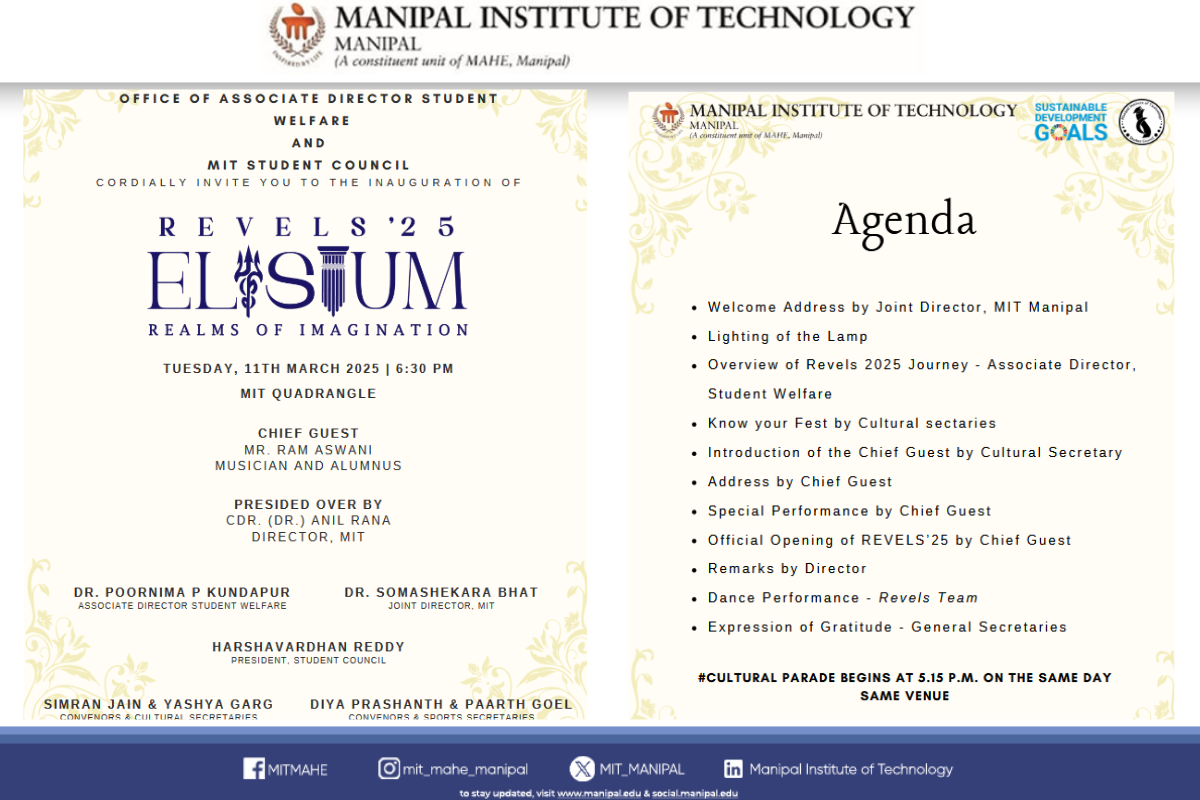 The Office of the Associate Director - Student Welfare and the MIT Student Council cordially invite you to the grand inauguration of Revels '25 – "ELYSIUM: Realms of Imagination", scheduled to take place on Tuesday, 11th March 2025, at 6:30 PM at the MIT Quadrangle.