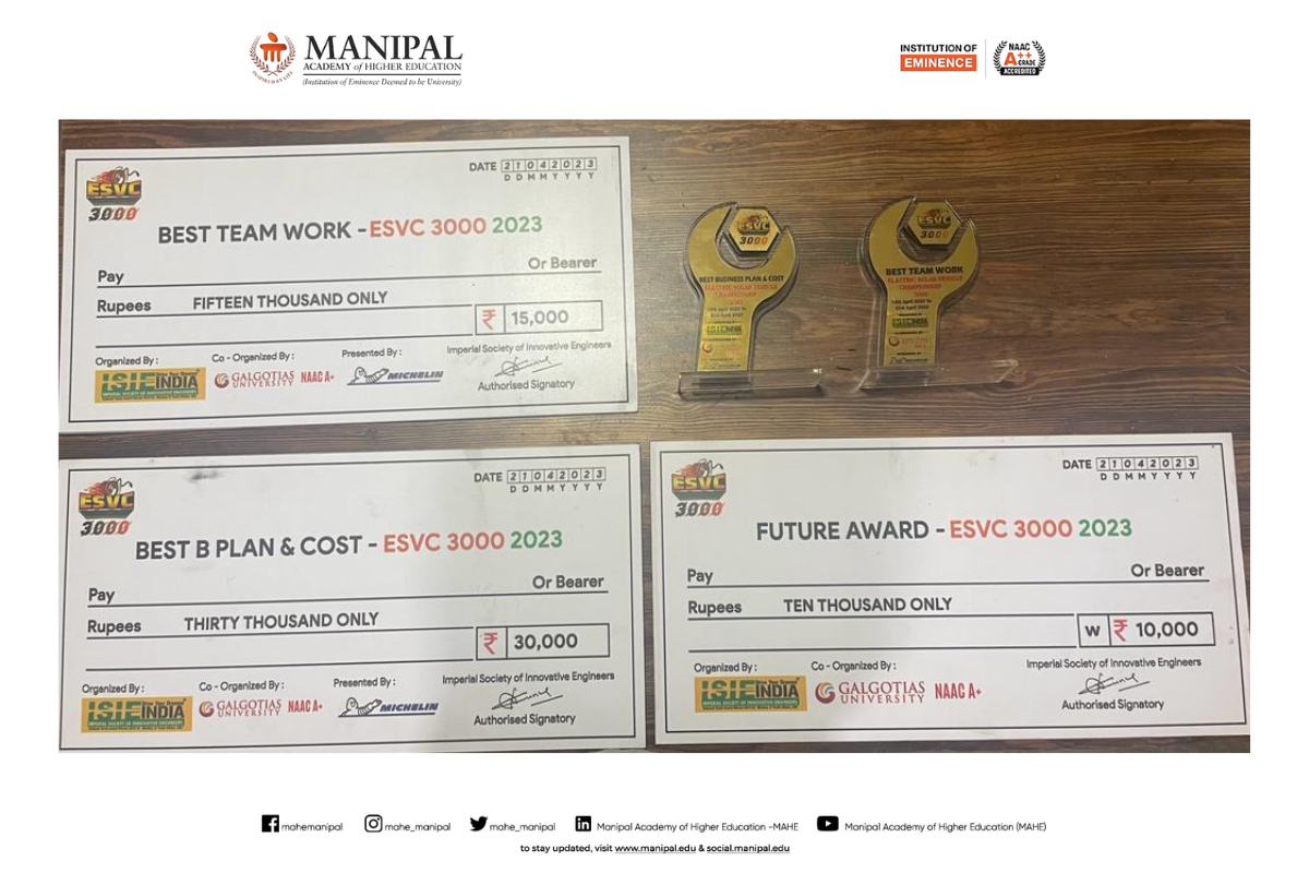 We proudly announce that SolarMobil Manipal Team bagged multiple awards in the Electric Solar Vehicle Championship from 14th April to 21st April 2023.