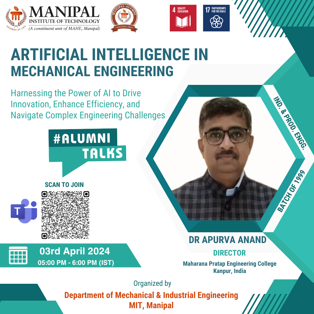- Alumni Talk by Dr. Apurva Anand, Professor and Director, Maharana Pratap Engineering College, Kanpur - Artificial Intelligence in Mechanical Engineering, 03 April, 5-6 PM. (Know more)