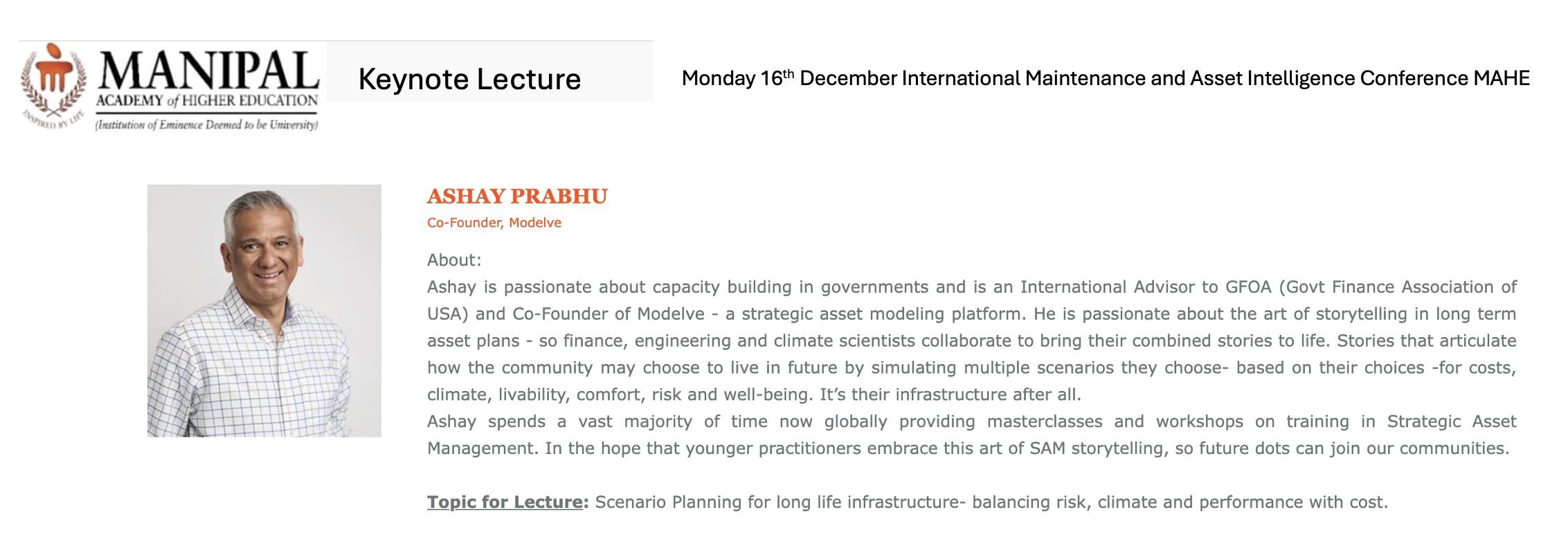 - Keynote Lecture in International Conference ICMIAM 2024: Scenario Planning for long life infrastructure- balancing risk, climate and performance with cost - Ashay Prabhu, Co-Founder, Modelve. (Know more)
