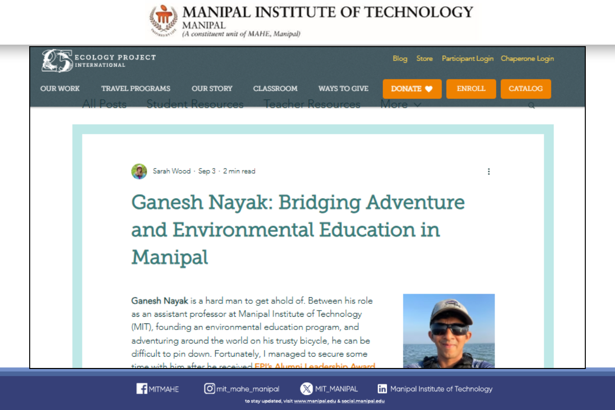 MIT Manipal proudly congratulates Ganesh Nayak and his dedicated team at the Centre for Outdoor Studies on being featured in an article by Ecology Project International highlighting their outstanding work in environmental education and leadership development.