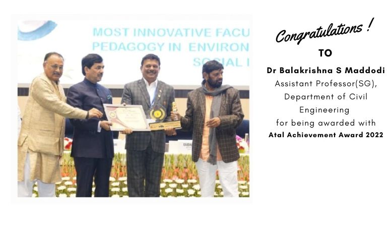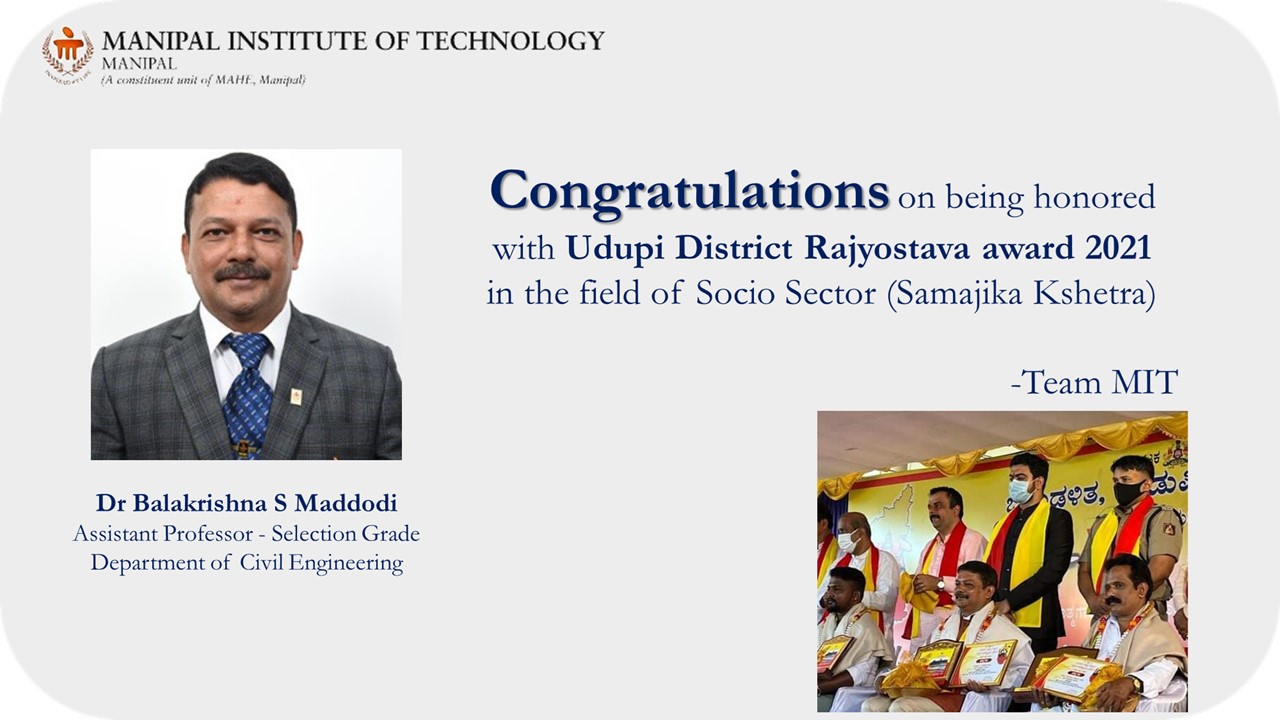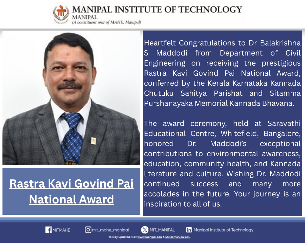 We proudly congratulate Dr. Raghavendra K. Holla, Faculty Member, Department of Civil Engineering, MIT Manipal, on being honored with the prestigious Anantha Mitra Kalabhavi Award. The award was conferred during the Engineers’ Day Celebrations and Techno Week program held at St. Sebastian Church Hall, Bendur, on 18th September 2025.