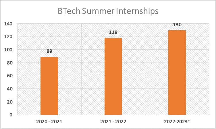 They get to adapt to the industry environment better and faster. It also ensures they are productive from day one of their professional careers. Most industries encourage and appreciate this concept, as it is a win-win situation for the industry and the institute. Industries of repute have been recruiting our students for internships in increasing numbers over the years. Most students translate their convertible-internship opportunities into full-time employment (FTE) offers. The students are encouraged to do summer internships during the summer or winter breaks of the second and third year, which help them plan the Practice School project in an organisation during the final semester. In addition to this, industries offer in-semester projects to the students. During the program, these projects help the students be abreast of the latest developments and tools used in the industrial field. All these initiatives help the students prepare for the final year Practice School project of their choice. In the 2022-23 placement season, 872 students secured practice school internship offers.