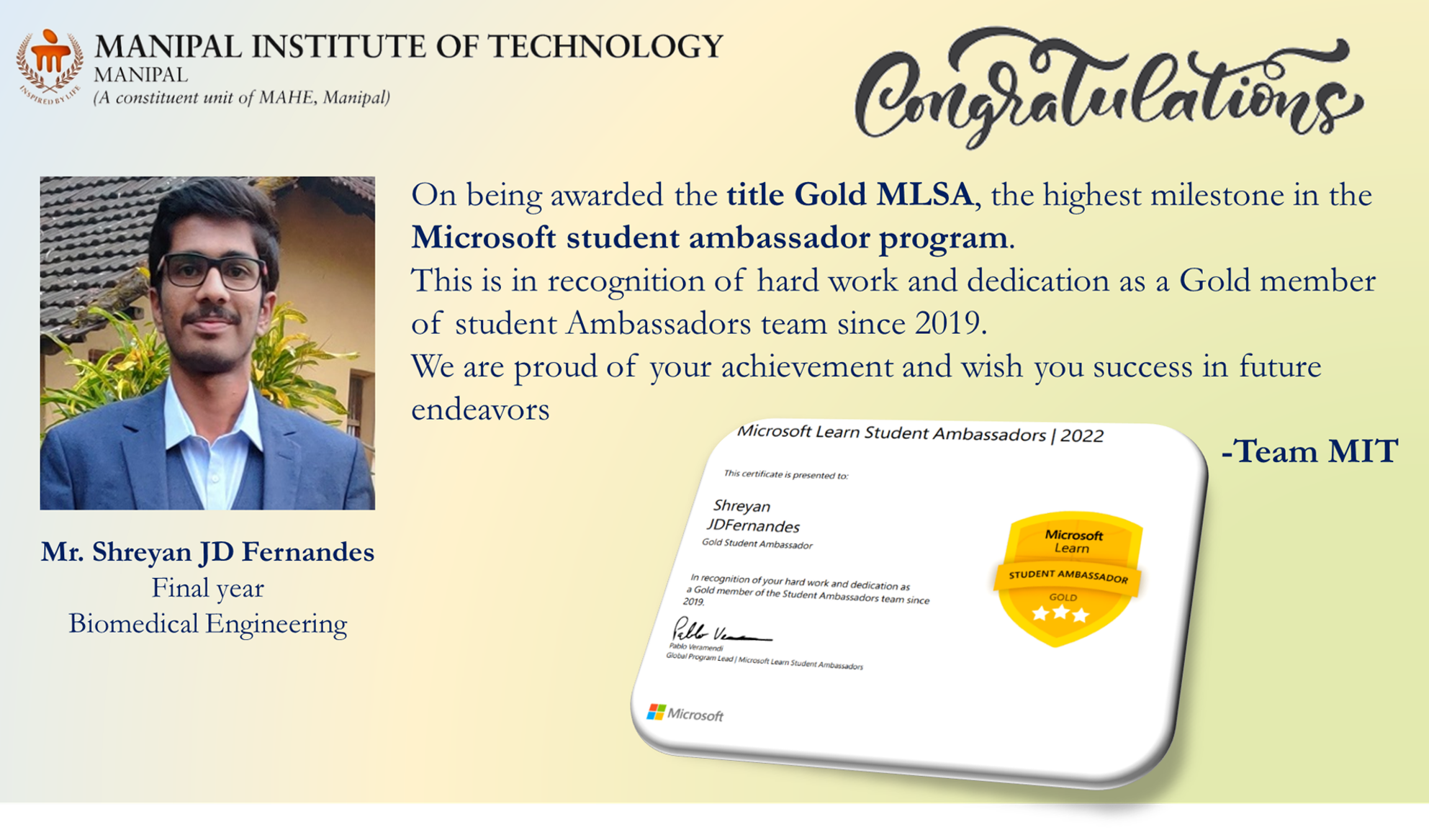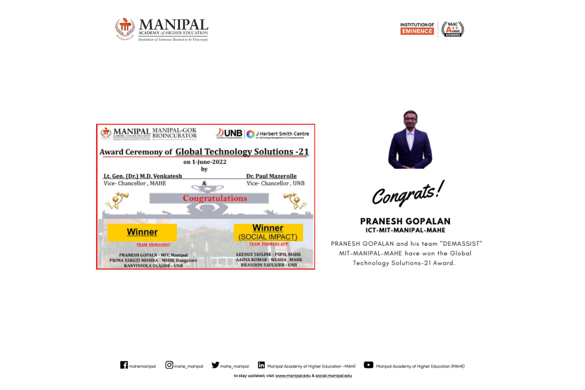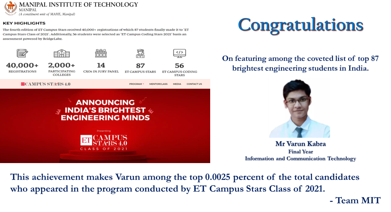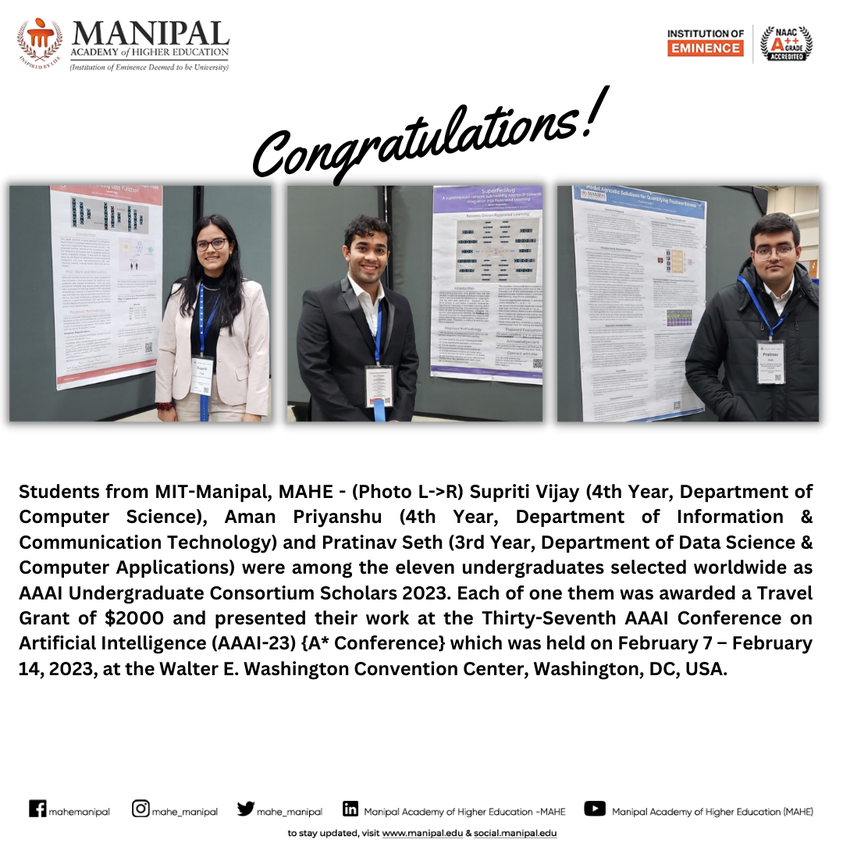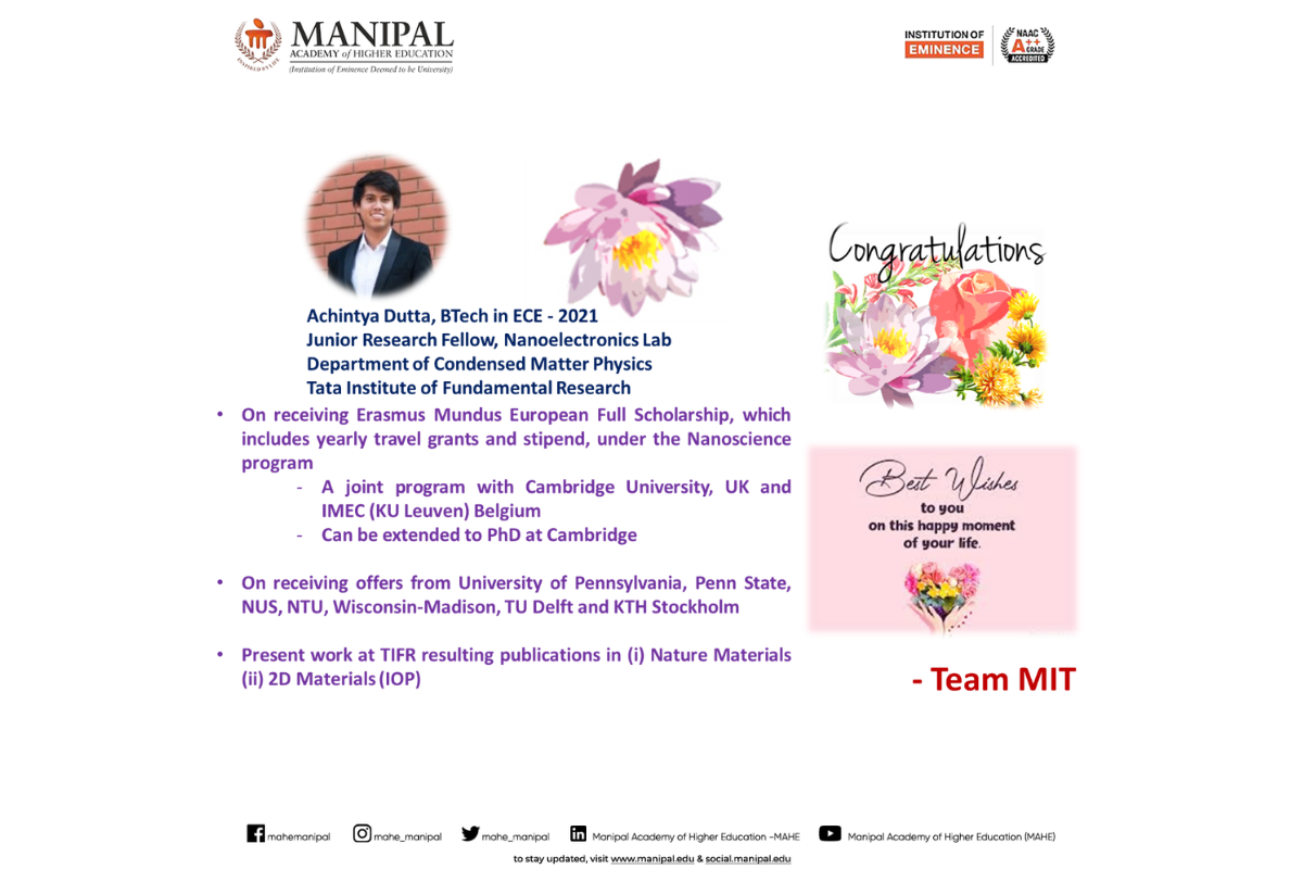 Priyanshu is among only five recipients across Manipal Academy of Higher Education (MAHE), Manipal, making this a moment of great pride for MIT. His dedication to academic excellence, innovation, and leadership continues to inspire his peers.