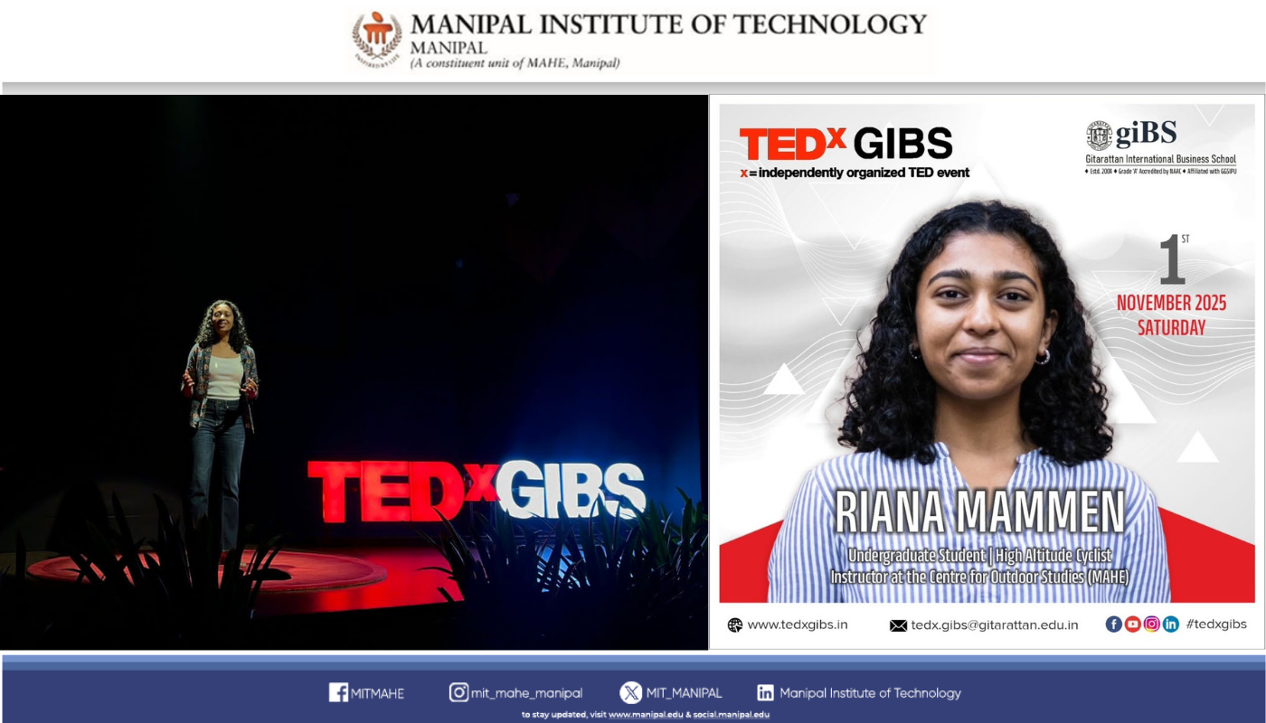 The Centre for Outdoor Studies (COS), MIT Manipal, continues to empower students to grow as confident leaders and communicators through experiential learning. A testament to this vision is Riana Mammen, a third-year student at MAHE, who recently delivered a TEDx Talk at GIBS, Delhi, titled “Cycling 400km Through Spiti Valley.” Her talk, inspired by her COS-led expedition, recounted leading seven students on a 20-day, 400+ km high-altitude cycling journey through Spiti Valley — an experience that tested endurance, decision-making, and emotional strength.
