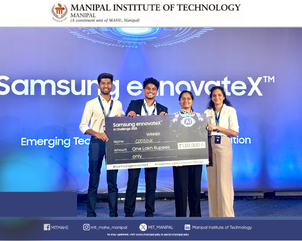 Manipal Institute of Technology (MIT), Manipal achieved outstanding success at the prestigious Samsung EnnovateX AI Challenge 2025, a national-level innovation contest that drew participation from over 1,000 teams across India. Team COD3INE — comprising Chanikya Gajjarapu, Nithya Reddy Lingala, Vikranth EC, and Varsha EC — secured the First Prize, winning ₹1,00,000 at the Grand Finale held on 18 September 2025 at Taj Yeshwantpur, Bengaluru.