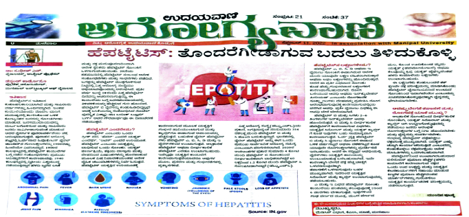 MIV Manipal, September 12, 2022: An article on “Hepatitis virus infection and awareness” written by Dr. Sudheesh N & Mr. Desmond Cardoso was published in the Udayavani newspaper.
