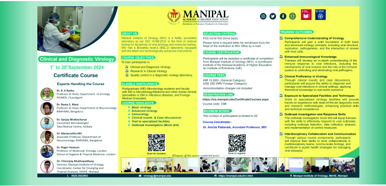 The Manipal Institute of Virology (MIV) offers a comprehensive three-week Clinical & Diagnostic Virology Certificate Course. This intensive program equips participants with the knowledge and skills necessary for advanced roles in virology and infectious disease management.