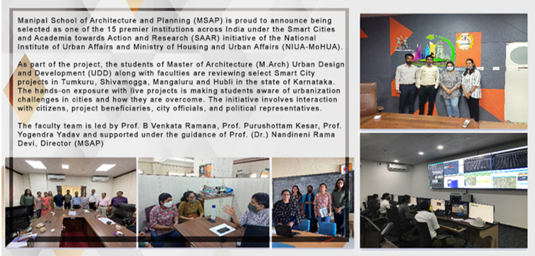 Manipal School of Architecture and Planning (MSAP) is proud to announce being selected as one of the 15 premier institutions across India under the Smart Cities and Academia towards Action and Research (SAAR) initiative of the National Institute of Urban Affairs and Ministry of Housing and Urban Affairs (NIUA-MoHUA). As part of the project, the students of Master of Architecture (M.Arch) Urban Design and Development (UDD) along with faculties are reviewing select Smart City projects in Tumkuru, Shivamogga, Mangaluru and Hubli in the state of Karnataka. The hands-on exposure with live projects is making students aware of urbanization challenges in cities and how they are overcome. The initiative involves interaction with citizens, project beneficiaries, city officials, and political representatives.