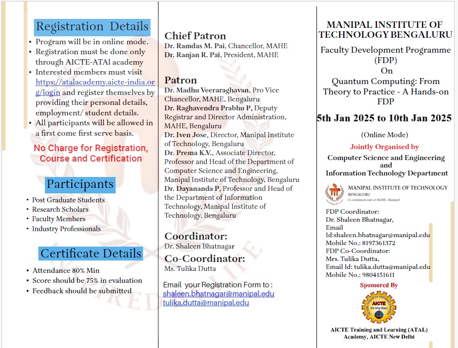 Join us in exploring the transformative field of quantum computing with immersive, hands-on sessions designed to empower your professional growth. This FDP is a valuable opportunity to enhance your skills, expand your knowledge, and stay at the forefront of technological advancement.