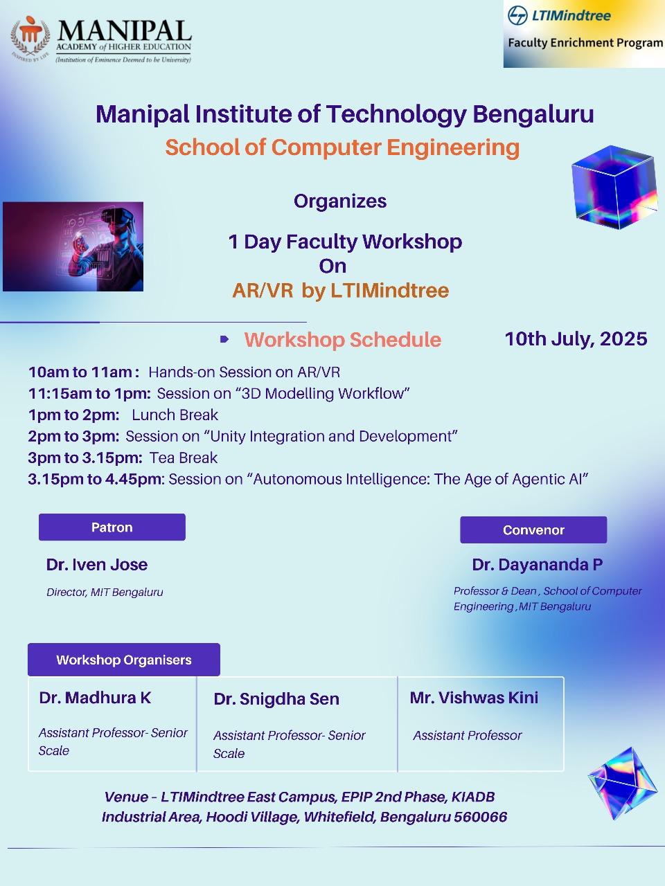 One Day Faculty workshop on AR/VR @ LTIMindtree office for the faculty of School of Computer Engineering, MIT Bengaluru on 10.07.2025