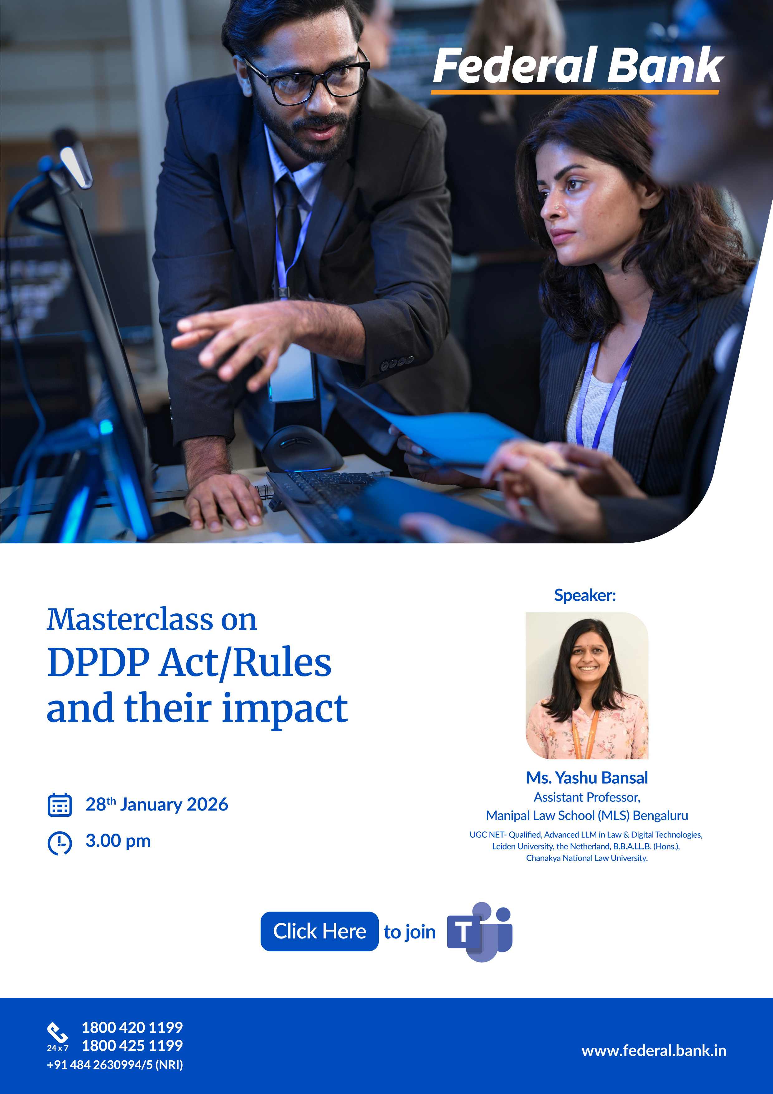 Our faculty, Ms. Yashu Bansal, was invited to conduct an awareness session on the occasion of International Data Privacy Day, for the employees of Federal Bank in Kerala. Celebrated on January 28 every year, the event received overwhelmingly positive response and helped employees in understanding the Digital Personal Data Protection Act, 2023.