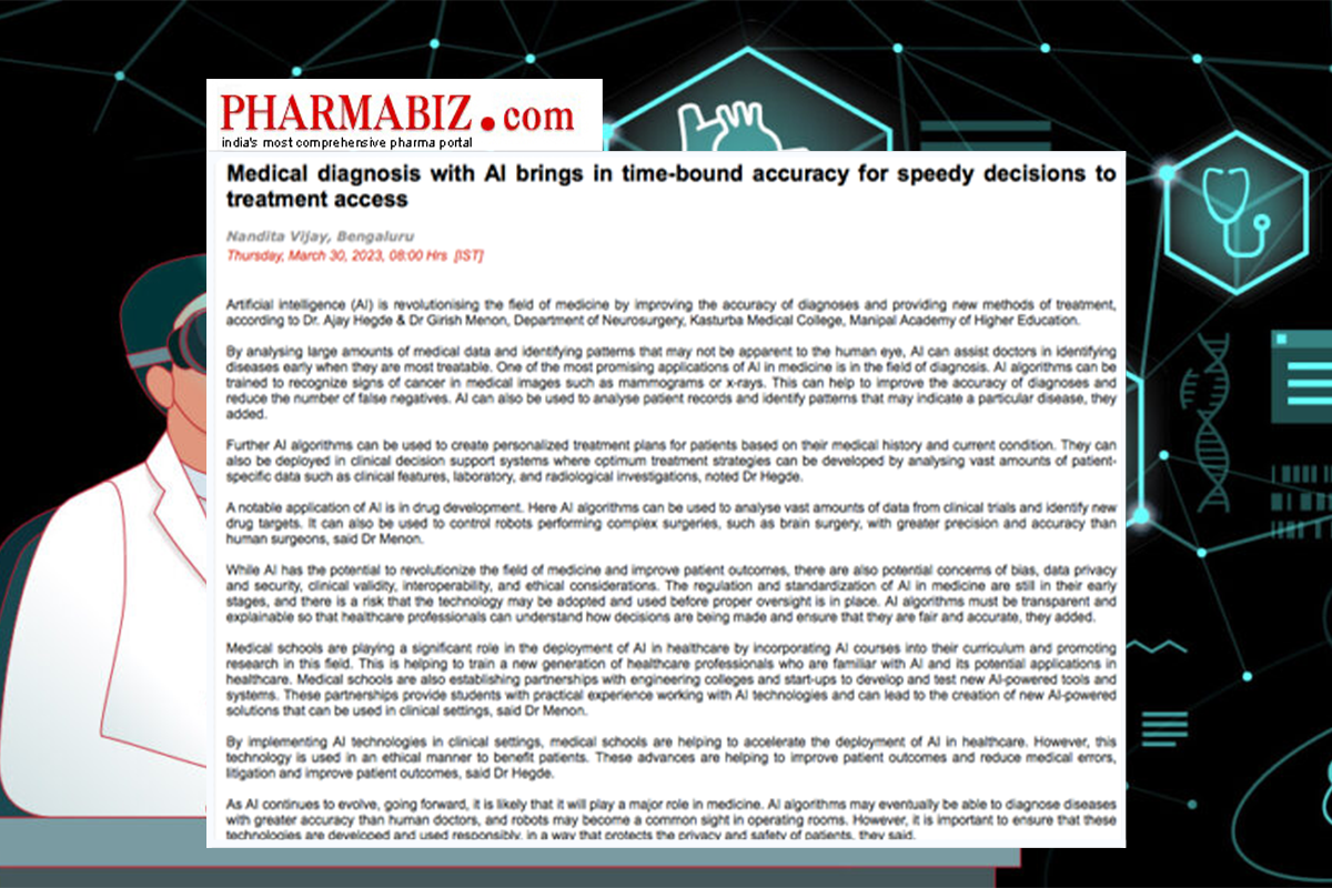 Manipal, March 30th, 2023: The author's article, "Medical diagnosis with AI brings in a time bound accuracy for speedy decisions to treatment access" by Dr. Ajay Hedge & Dr. Girish Menon, Department of Neurosurgery, Kasturba Medical College (KMC), Manipal.