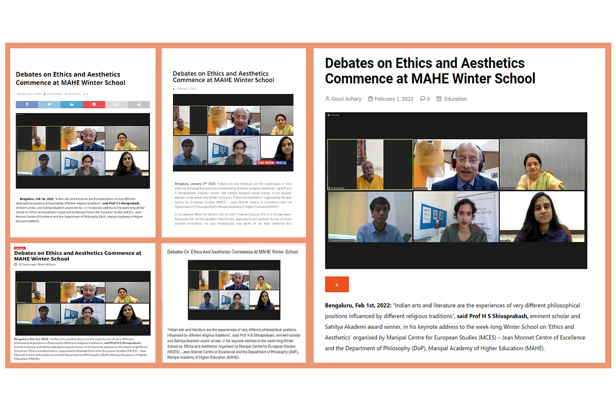 Manipal, February 2nd 2022: “Indian arts and literature are the experiences of very different philosophical positions influenced by different religious traditions”, said Prof H.S Shivaprakash, eminent scholar and Sahitya Akademi award winner, in his keynote address to the week-long Winter School on ‘Ethics and Aesthetics’ organised by Manipal Centre for European Studies (MCES) - Jean Monnet Centre of Excellence and the Department of Philosophy (DoP), Manipal Academy of Higher Education (MAHE).