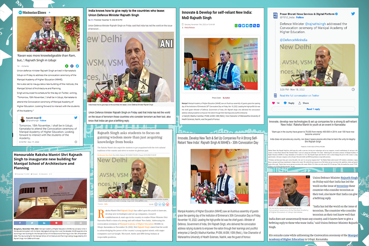 ‘Youth Education and Nation Building’ was the crux of the honourable minister’s message to the graduating students. Raksha Mantri Shri Rajnath Singh has called upon the youth to innovate, develop new technologies, and set up companies, research establishments & start-ups in the country to realise Prime Minister Shri Narendra Modi’s vision of a strong and self-reliant ‘New India’. Addressing the convocation ceremony of Manipal Academy of Higher Education (MAHE) , Manipal Shri Rajnath Singh stated that “the world is acknowledging the power of the country’s young, ignited minds, with major companies such as Google, Microsoft, Adobe, and IBM hiring Indians at respectable positions. The Raksha Mantri lauded the Manipal Group of Educational Institutions for their contribution to education and research. He congratulated the graduating students, encouraging them to move forward despite hurdles to create a better future. He extended special congratulations to the girl students, exuding confidence that they will be the pillars of a strong and prosperous ‘New India’.
