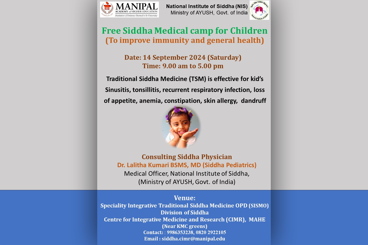 MAHE will organise a Free Siddha Medical Camp for children to boost immunity and promote general health on 14th September 2024. This special camp aims to provide holistic healthcare through Siddha medicine, focusing on natural remedies and therapies to enhance overall well-being.