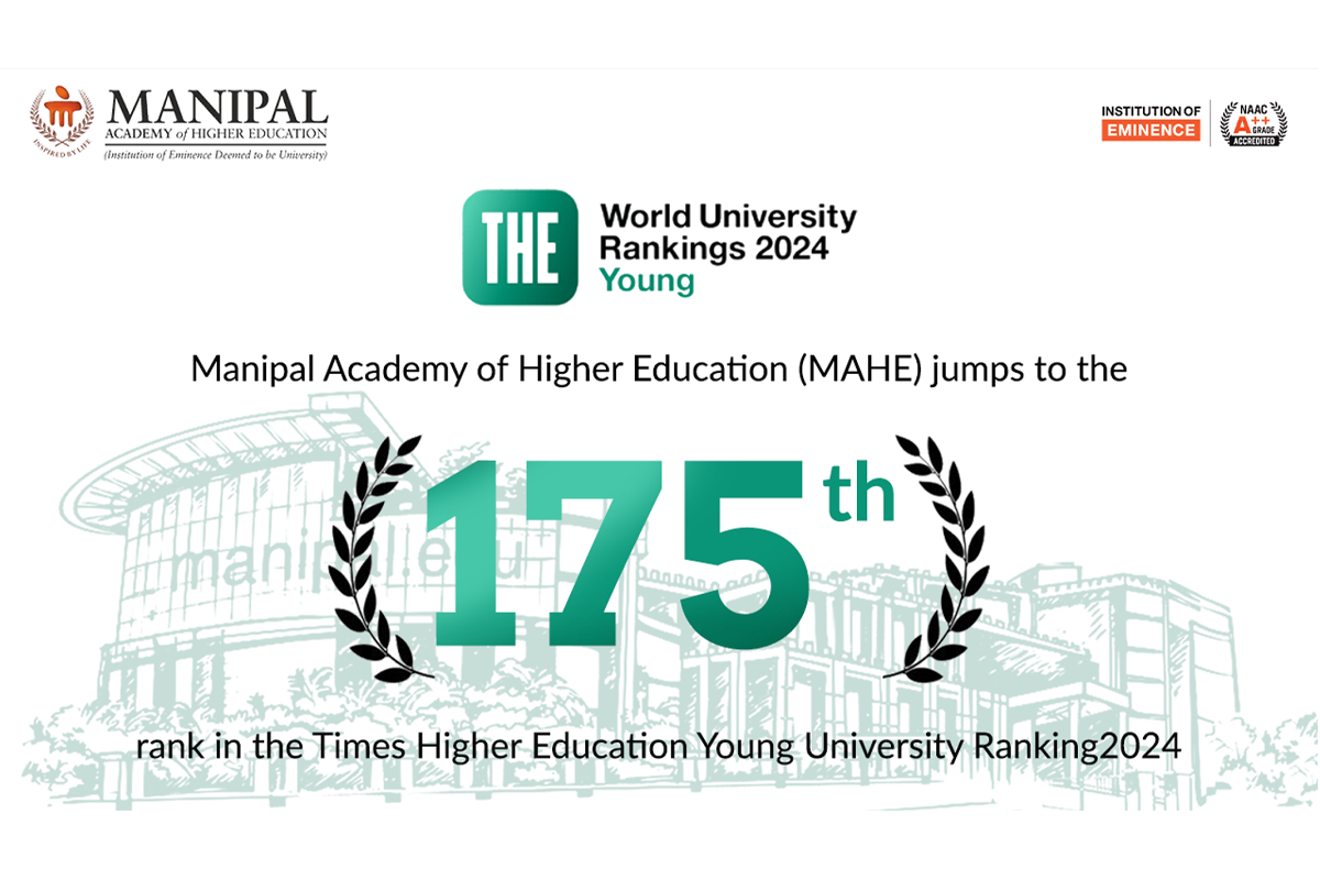 Manipal, 20 May 2024: Manipal Academy of Higher Education (MAHE), an Institution of Eminence, deemed to be university, one of India’s leading research-focused educational institutions, has jumped to the 175th spot in the Times Higher Education Young University Ranking, with an overall score of 43.6. This marks an impressive improvement of 75 positions from the previous ranking band of 251-300, upholding MAHE’s position as an institution dedicated to academic excellence and innovation.