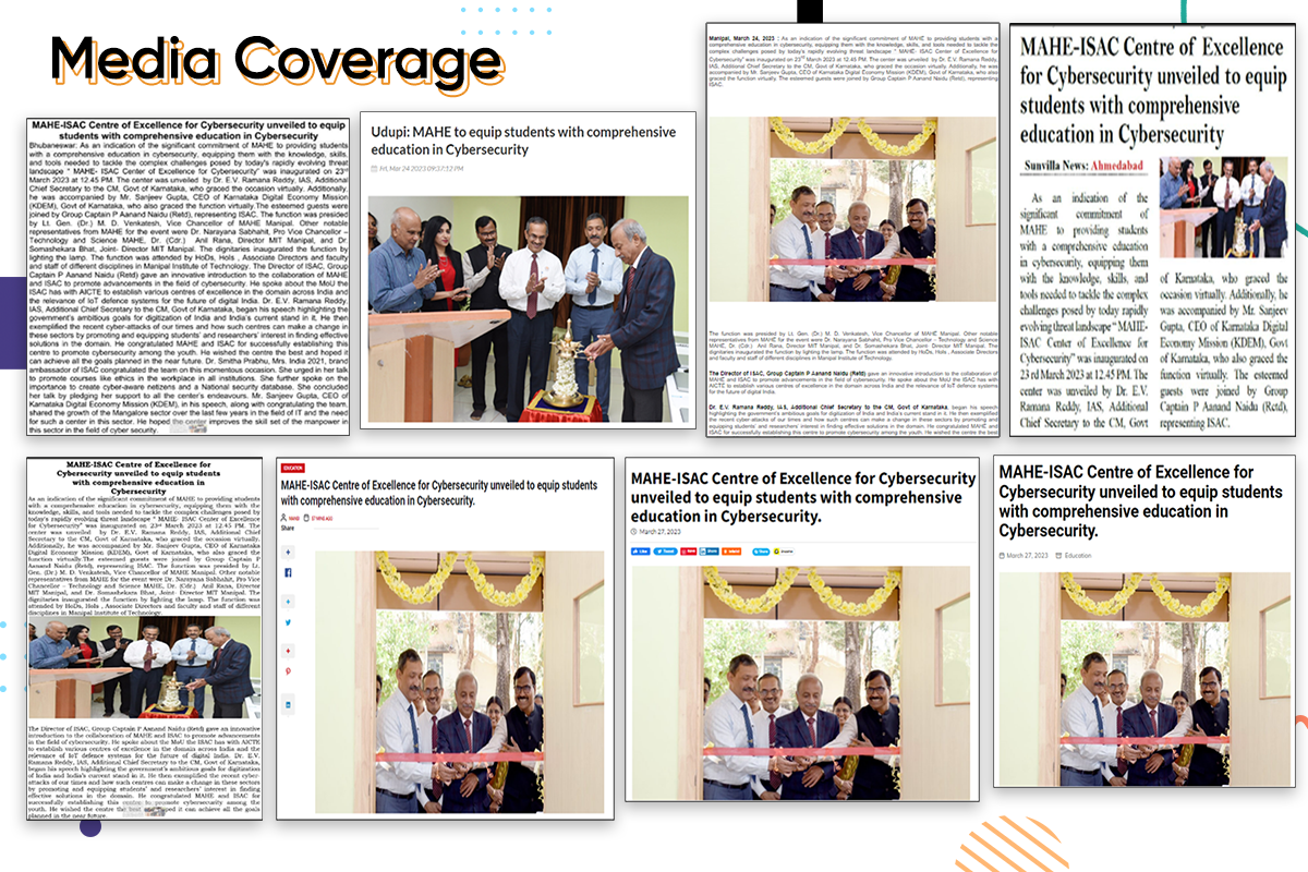Lt. Gen. (Dr.) M. D. Venkatesh, Vice Chancellor of MAHE Manipal, stated that the "MAHE- ISAC Center of Excellence for Cybersecurity" is a feather in MAHE's cap, as the center plays a vital role in providing its students with a comprehensive education in the field of cyber security, equipping them with the knowledge, skills, and tools necessary to tackle the complex challenges posed by today's rapidly evolving threat landscape. He expressed the management’s happiness in the establishment of such a center and gave the center his best wishes.