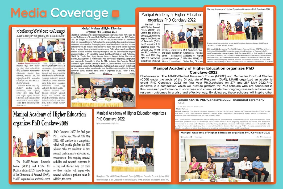 Manipal 04th June 2022: The Manipal Academy of Higher Education (MAHE), Manipal -Student Research Forum (MSRF), and Centre for Doctoral Studies (CDS) under the aegis of the Directorate of Research (DoR), MAHE organized an academic event ‘Ph.D. Conclave -2022’ for final year Ph.D. scholars on 27th and 28th May 2022. Ph.D. Conclave is a competition that will provide a platform for Ph.D. scholars who are consistent in their research performance to showcase and communicate their ongoing research activities and research outcomes in a crisp and effective way. By doing so, these scholars will inspire other research scholars to perform better. In addition, the event will facilitate interaction among Ph.D. scholars, researchers, and faculty members of other Institutions promoting the exchange of ideas and innovations.