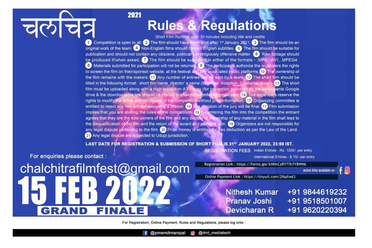 The 5th edition of Manipal International Short Film Festival & Competition, Chalchitra hosted by the Department of Media Technology (MIT) Manipal, in association with Udayavani.com, registration for the Manipal International shot film festival & completion has already been started the last date for registration & submission for the short film is 31st January 2022.