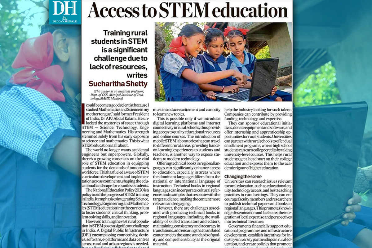 Manipal, March 05, 2024 – The author's article, "Access to STEM education", by Dr Sucharitha Shetty, Asst. Professor-Senior, Dept. Of CSE, Manipal Institute of Technology (MIT), Manipal.