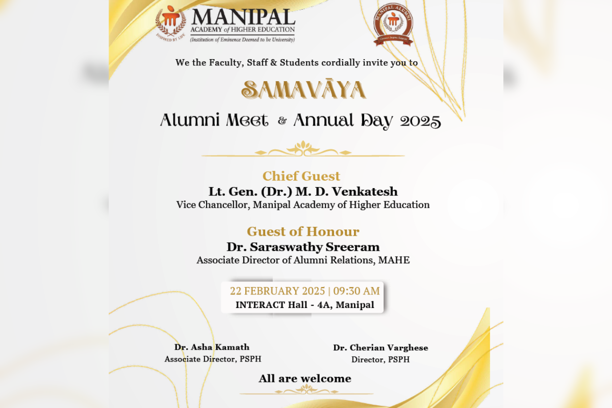 The Prasanna School of Public Health (PSPH), Manipal, will host its Alumni Meet and Annual Day Celebration on February 22nd, 2025, at Interact Hall, 4A, Manipal. This significant event will unite alumni, faculty, and students to honour accomplishments, reconnect, and enhance professional connections.