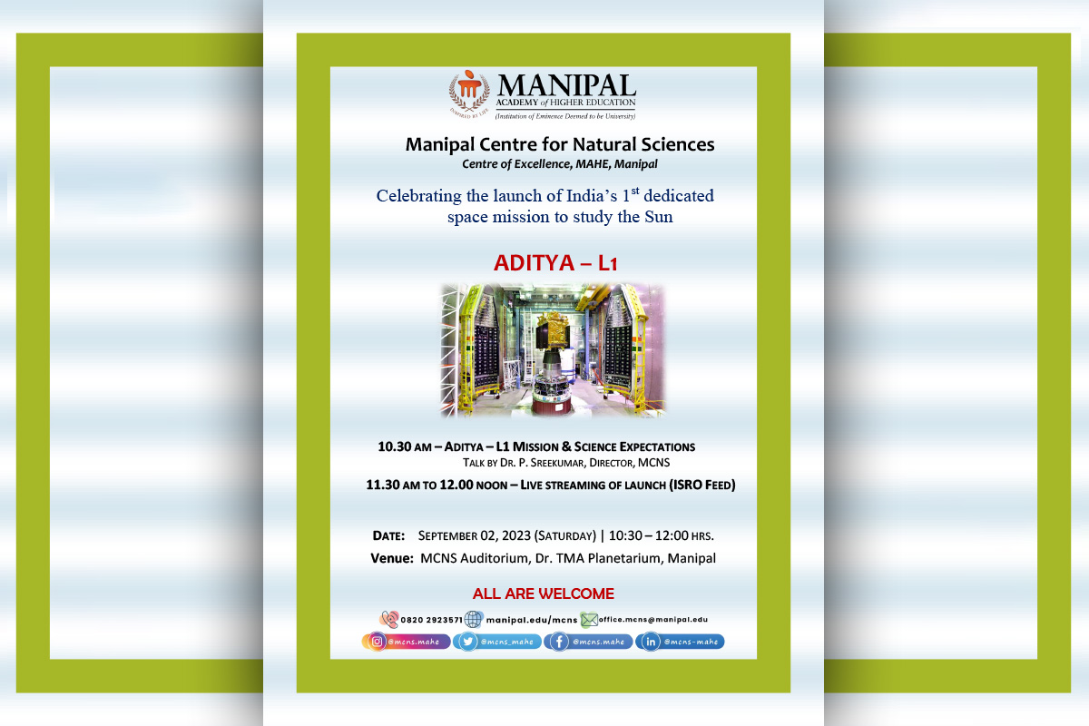 Indian Space Research Organisation ISRO has set the date for the launch of India's first solar mission on September 2 2023. Aditya-L1 is the first space-based observatory-class Indian solar mission to study the Sun; The Manipal Centre for Natural Sciences (MCNS), Manipal is gearing up to provide an engaging and informative experience by live broadcasting the launch event at Dr. TMA Pai Auditorium.