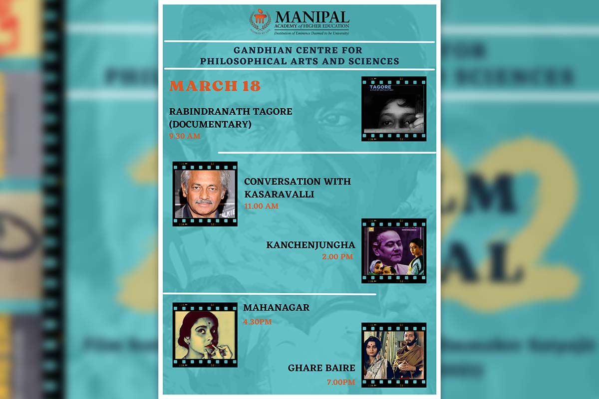 Manipal, 16th March 2022: The three-day Satyajit Ray Film Festival (March 17- 19, 2022) will be inaugurated by renowned filmmaker Girsh Kasaravalli on March 17 at 4 pm. The film festival, which commemorates the birth-centenary of master filmmaker Satyajit Ray (1921-2021), is being organized by Gandhian Centre for Philosophical Arts and Sciences, MAHE, Manipal.