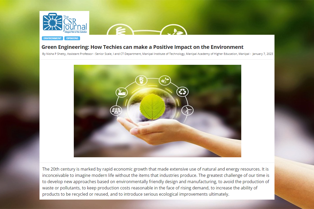The author’s article, “Green Engineering: How Techies can make a Positive Impact on the Environment”, by Nisha P Shetty, Assistant Professor - Senior Scale, I and CT Department, Manipal Institute of Technology (MIT), Manipal.