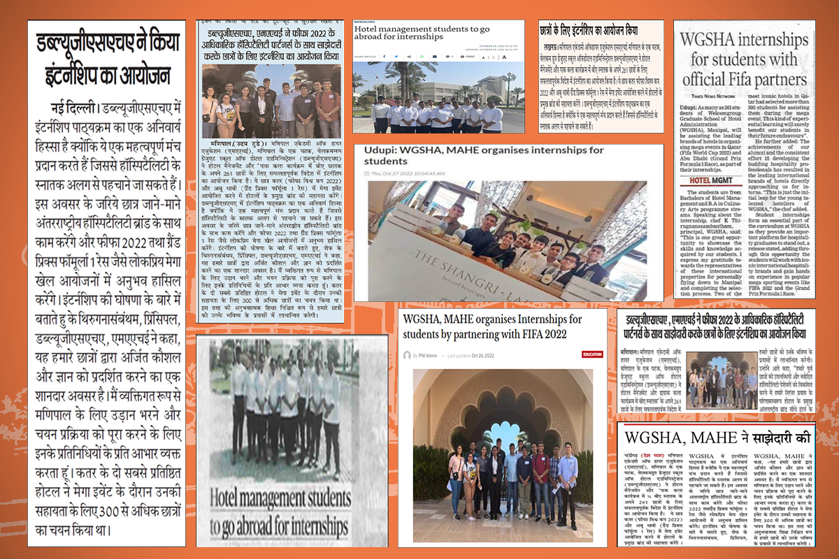 Manipal 27th October 2022: Welcomgroup Graduate School of Hotel Administration (WGSHA), a constituent of Manipal Academy of Higher Education, Manipal, has successfully organized abroad internships for two hundred sixty-one (261) of its students of Bachelors of Hotel Management and B.A in Culinary Arts program. These students will be assisting the leading brands of hotels in organizing mega events in Qatar (FIFA World Cup 2022) and Abu Dhabi (Grand Prix Formula 1 Race).