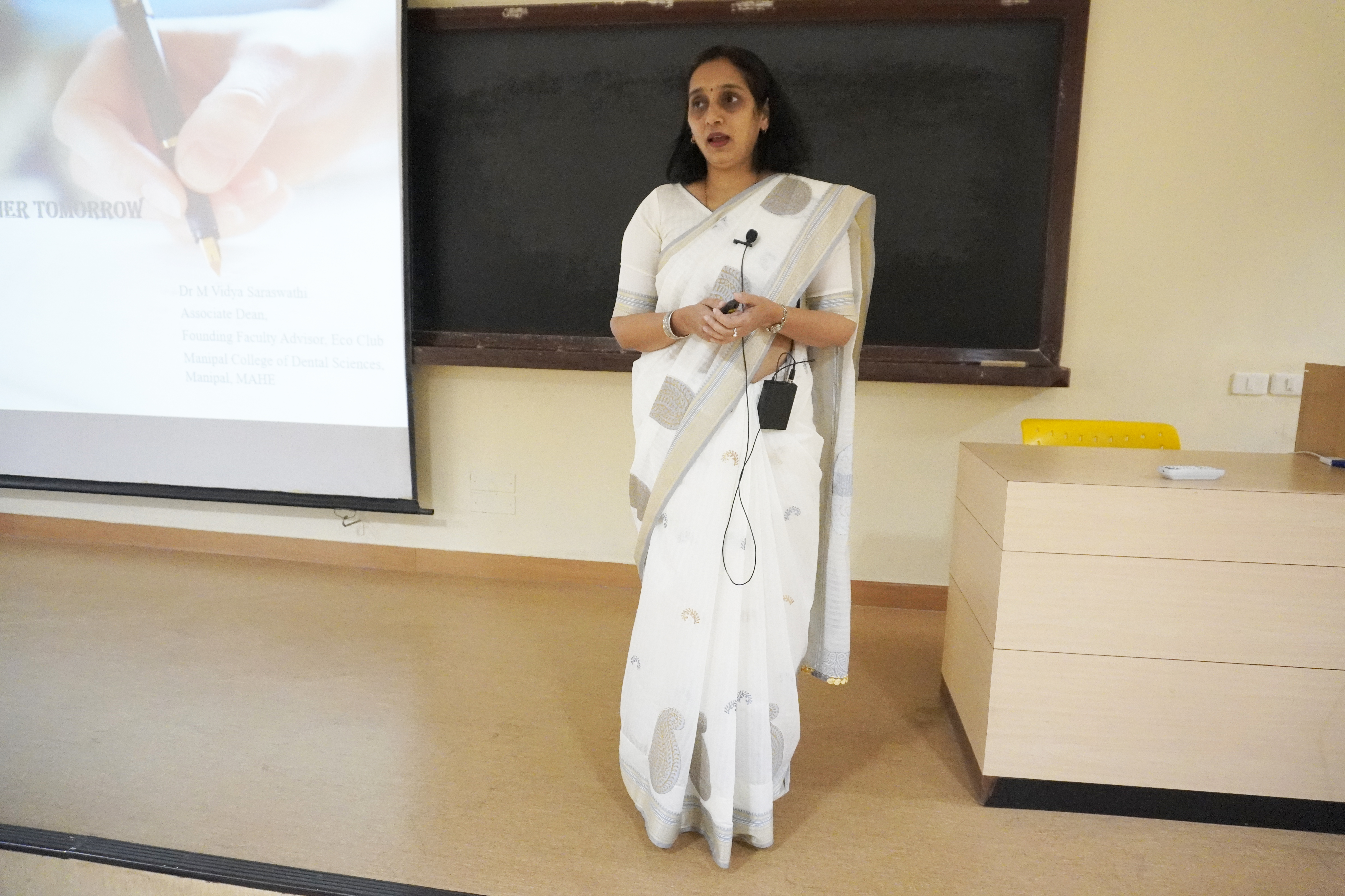 Dr M Vidya Saraswathi, Associate Dean; Professor, Department of Conservative Dentistry and Endodontics; Faculty Advisor- Eco Club; Nasha Mukt Club; Manipal was the resource person and spoke on eco-friendly pens (refurbish, recycle, reuse); how pens can be made using sustainable eco-friendly materials in such a way that they can be recycled, and reused without causing harm to the environment, to living beings; how ink pens filled, refilled with organic ink can be reused; how ballpoint pens with refills can be reused.