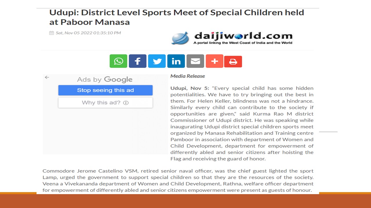 Udupi District Special Children Sports Meet was organized by Manasa Rehabilitation and Training Centre, Pamboor, Manasa, Udupi District in association with the Department of Women and Child Development, Udupi District; Department for Empowerment of Differently Abled and Senior Citizens, Udupi District on Saturday, November 05, 2022. Mr. Kurma Rao M district commissioner of udupi district innaugrated the programme.