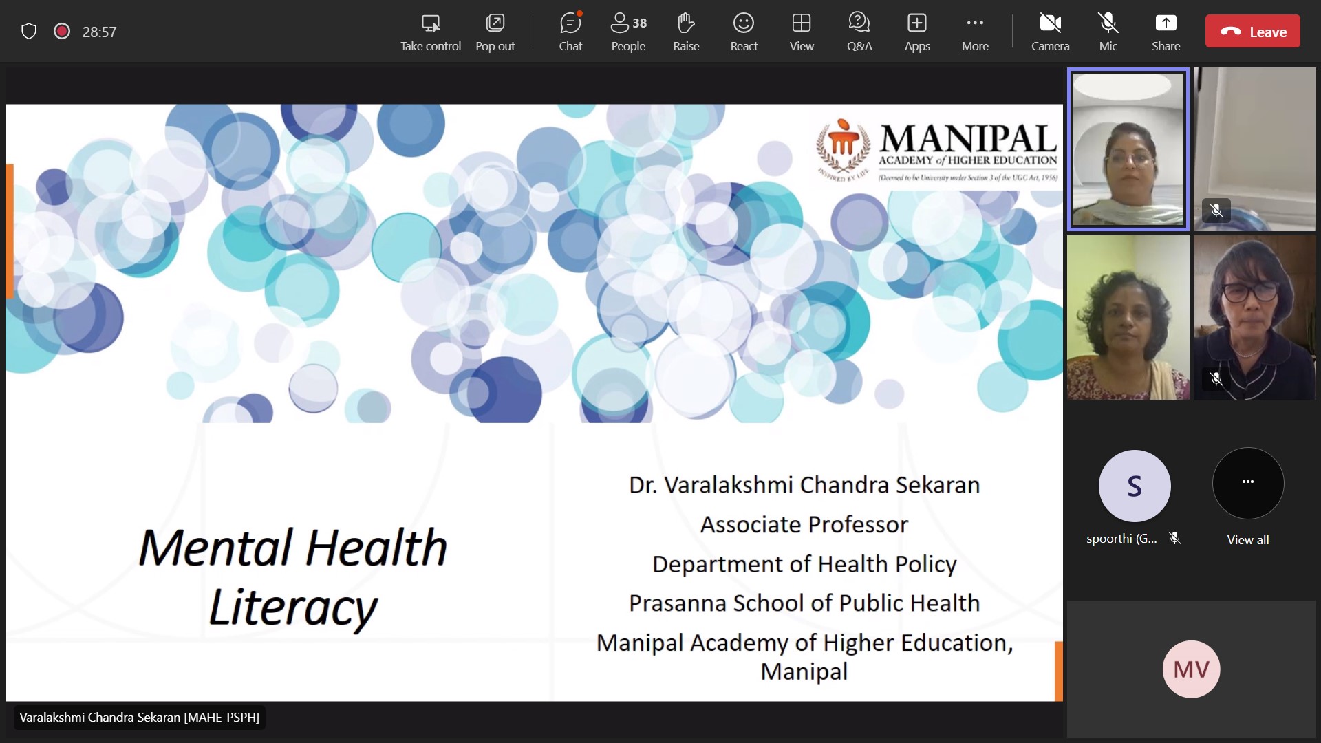 Manipal Health Literacy Unit (MHLU), Department of Social and Health Innovation (DoSHI), Manipal and Asian Health Literacy Association (AHLA) jointly organized the Health Literacy Webinar – 4 on Dementia Literacy: Advancement and Future Research and Mental Health Literacy.''