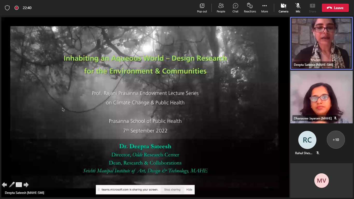 Prasanna School of Public Health, Manipal Academy of Higher Education, Manipal organized Prof Rajani Prasanna Endowment Lecture Series (IV) on Climate Change and its Impact on Public Health - Inhabiting an Aqueous World – Design Research for the Environment and Communities Virtually through Microsoft Teams on Wednesday, September 07, 2022.